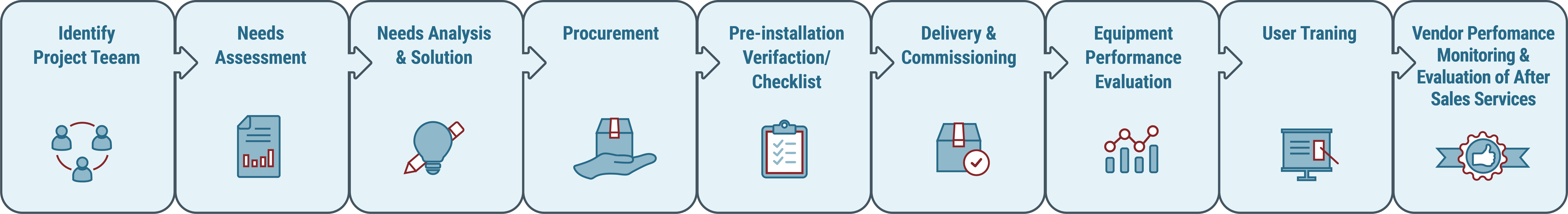 The procurement process for products such as reagents and test kits is relatively straightforward. However, when it comes to acquiring major equipment like imaging machines, waste management systems, sequencing equipment, and analyzers, a more detailed approach is needed to ensure