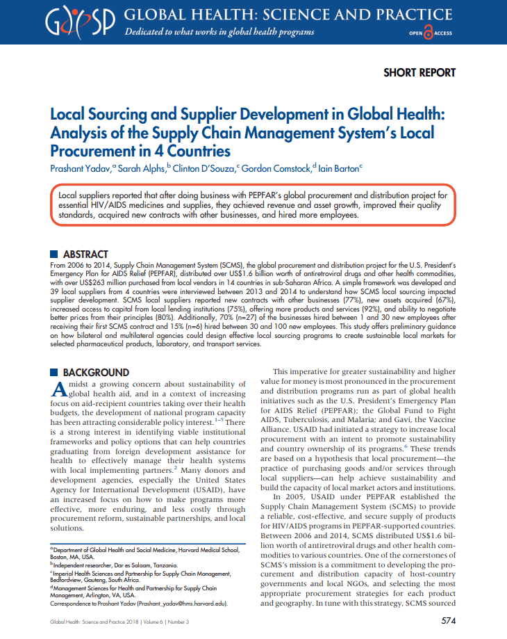 PFSCM is pleased to announce that our coauthored report on the positive effects of local sourcing and supplier development has been published in the esteemed open-access, peer-reviewed, online journal Global Health: Science and Practice (GHSP), which is aimed at improving health practice, especially in low- and middle-income countries.