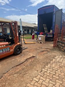At the warehouse, equipment was grouped and labeled by region and facility, enabling structured downstream delivery. Final-mile distribution required tailored logistics solutions, including the use of forklifts to offload equipment at facilities with limited truck access.